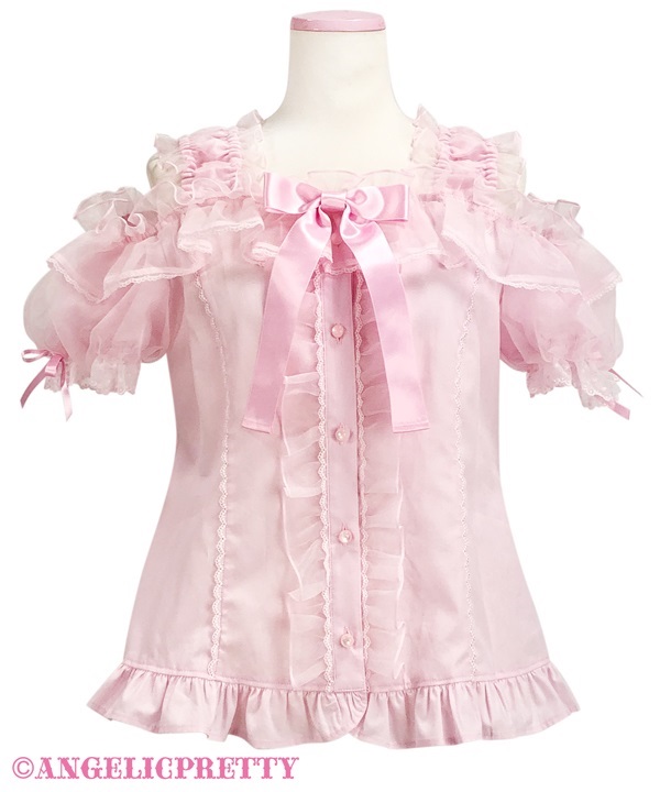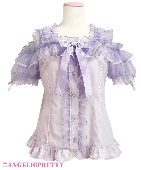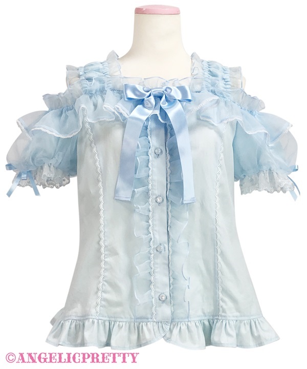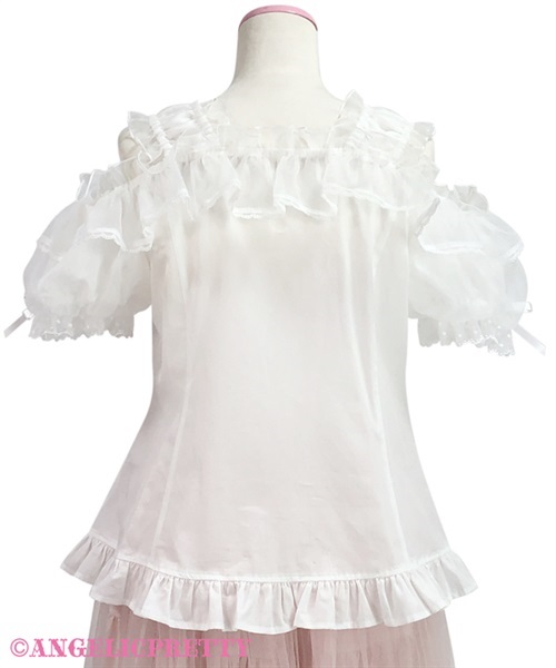オーガンジーのフリルが可愛らしいブラウス。 オフショルダーなので暑い季節も可愛くドレスアップできます♪ [素材] 表地:ブロード(綿100%) 別地:オーガンジー(ポリエステル100%) [レース] チュールレース ケミカルレース トーションレース ☆袖、フリルに別地を使用しています。 ☆胸元リボンブローチは取り外し可能です。