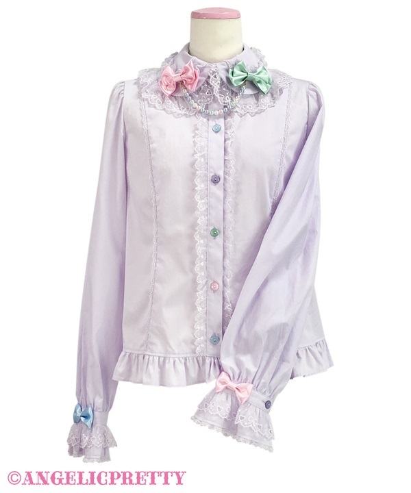 商品コード: 242B01-060399 襟元のパールがまるでネックレスのよう♪ 色とりどりのボタンやリボンがカラフルにトッピングされたスウィートなデザイン。 [素材] 表地:ブロード(綿100%) [レース] チュールレース ☆サテンリボン、パールを使用しています。 ☆ネックレスは取り外し可能です。